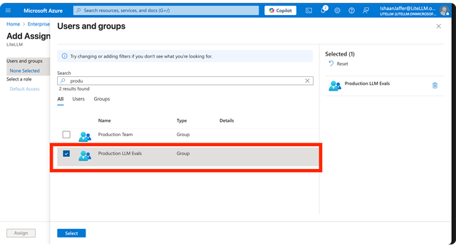 Now select the group you created in step 1.1. And add it to the LiteLLM Enterprise App. At this point we have added Production LLM Evals Group to the LiteLLM Enterprise App. The next step is having LiteLLM automatically create the Production LLM Evals Group on the LiteLLM DB when a new user signs in.